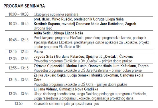 Na seminaru ćemo prezentirati metodologiju programa Ekoškole, tzv. „7 koraka“, postupak stjecanja i obnove statusa te predstaviti primjere dobre prakse u dječjem vrtiću, osnovnoj i srednjoj školi sa statusom Ekoškole.