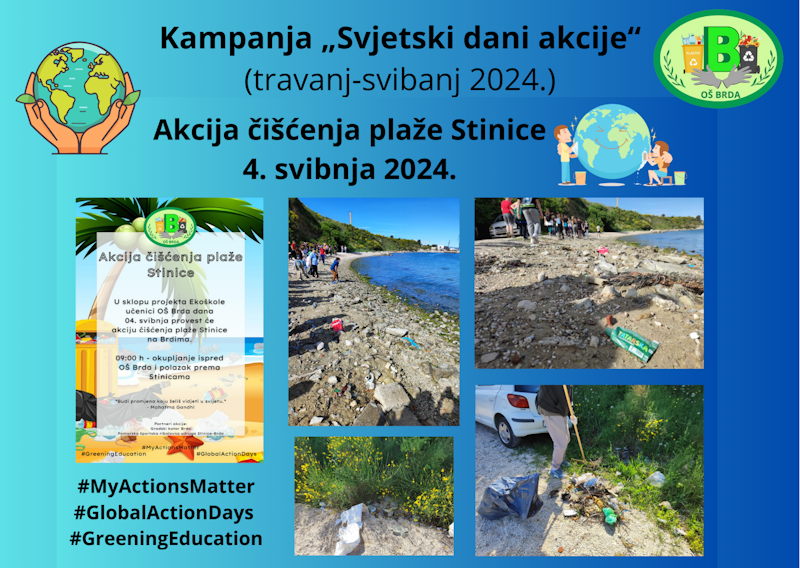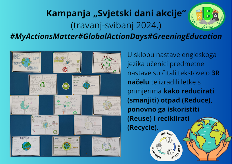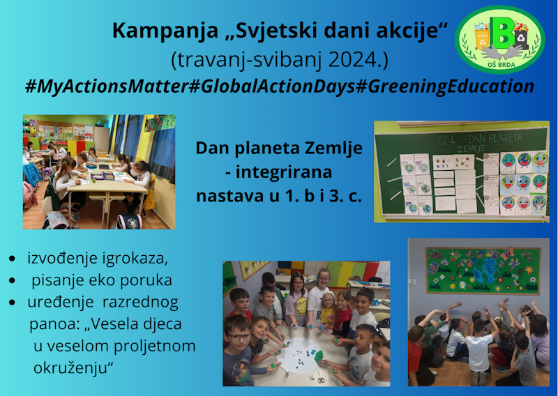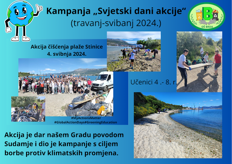 Učenici i djelatnici OŠ Brda iz Splita uključili su se u kampanju „Svjetski dani akcije“ s ciljem borbe protiv plastike i klimatskih promjena. Povodom Dana planeta Zemlje u školi su provedene različite eko aktivnosti. Učenici 1. b, 3. c i 4. c sa svojim učiteljicama prvo su očistili školski vrt, a zatim pripremili gredice za sadnju povrća. Učenici koji pohađaju satove izvannastavne aktivnosti Pirografija pripremili su drvene ploče za gredice u školskom vrtu. Dotrajale ploče su zamijenjene ili obnovljene. Provedena su 2 integrirana nastavna dana u 1. b i 3. c. Uz čišćenje gredica i skupljanje smeća izvodili su prigodne igrokaze, pisali eko poruke te uredili razredni pano „Vesela djeca u veselom proljetnom okruženju“. U sklopu nastave engleskoga jezika učenici predmetne nastave su čitali tekstove o 3R načelu te izradili letke s primjerima kako reducirati (smanjiti) otpad (Reduce), ponovno ga iskoristiti (Reuse) i reciklirati (Recycle).
