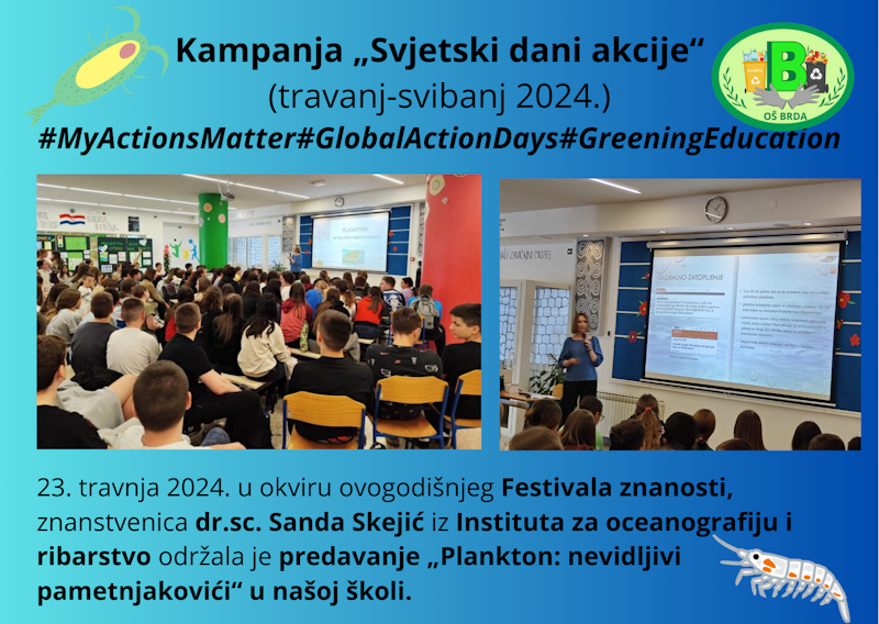 Dana 23. travnja 2024. u okviru ovogodišnjeg Festivala znanosti, znanstvenica dr.sc. Sanda Skejić iz Instituta za oceanografiju i ribarstvo održala je predavanje „Plankton: nevidljivi pametnjakovići“ u našoj školi. Kroz ovo predavanje učenici predmetne nastave otkrili su zašto je plankton značajan za život u moru te kako se prikupljaju i analiziraju uzorci u laboratoriju Instituta. Naučili su da čak i sateliti mogu mjeriti količinu plankotna u moru te su saznali još puno toga o životu u moru i prijetnjama globalnog zatopljenja.