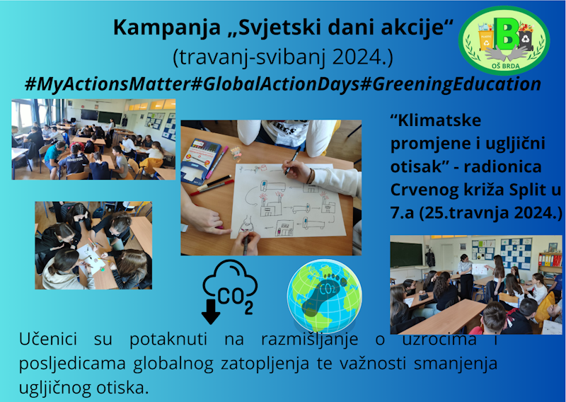Dana 25. travnja 2024. održana je radionica „Klimatske promjene i ugljični otisak“ za učenike 7. a razreda u organizaciji Crvenog križa Split. Učenici su potaknuti na razmišljanje o uzrocima i posljedicama globalnog zatopljenja te važnosti smanjenja ugljičnog otiska.