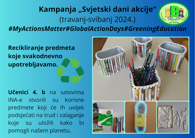 Učenici 4.b su, na satovima INA-e sudjelovali u kampanji „Svjetski dani akcije“ recikliranjem predmeta koje svakodnevno upotrebljavamo. Stvorili su koristan predmet koji će ih uvijek podsjećati na trud i zalaganje koje su uložili kako bi pomogli našem planetu.